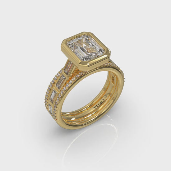 A celebration of modern love, this striking engagement ring features an emerald cut diamond in a sleek bezel setting. A bold architectural triple band provides a stunning backdrop. The center row of shimmering baguette diamonds adds contemporary brilliance, infusing contemporary style into a timeless silhouette. It's a romantic tribute to a love that's brighter every day.
