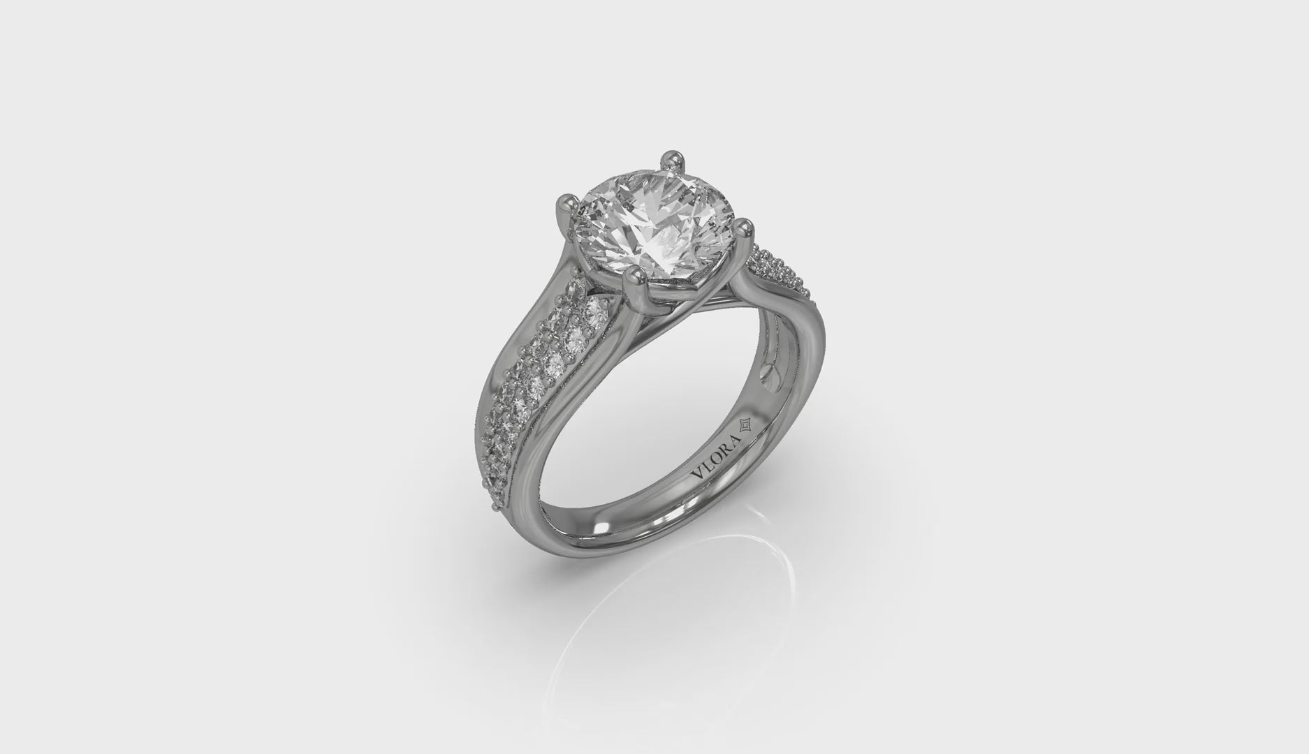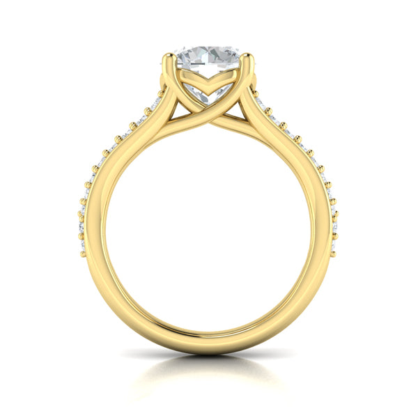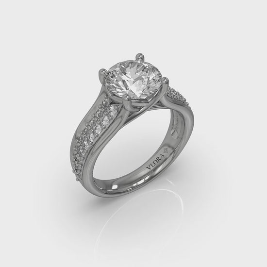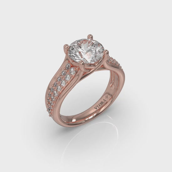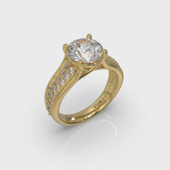 Elegance meets flair in a bold yet feminine engagement ring design. The round center diamond rises in a cathedral setting, its brilliance accentuated by a bold band adorned with luminous pave diamonds. Designed for those who cherish bold gestures and unforgettable love stories, this ring stands as a testament to strength, individuality, and endless sparkle.