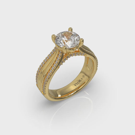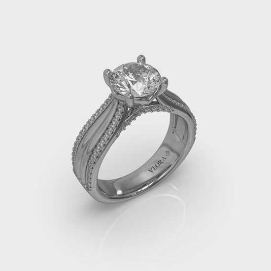 Just as love sweeps you off your feet, polished and sparkling strands combine to lift up the round center diamond in this dramatic engagement ring. The center round diamond is set in our signature V-shape setting to maximize brilliance. A bold band makes a statement, with pave details adding sparkle. It's a joyful way to begin your forever.