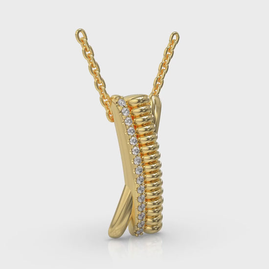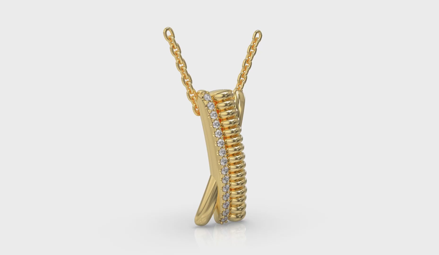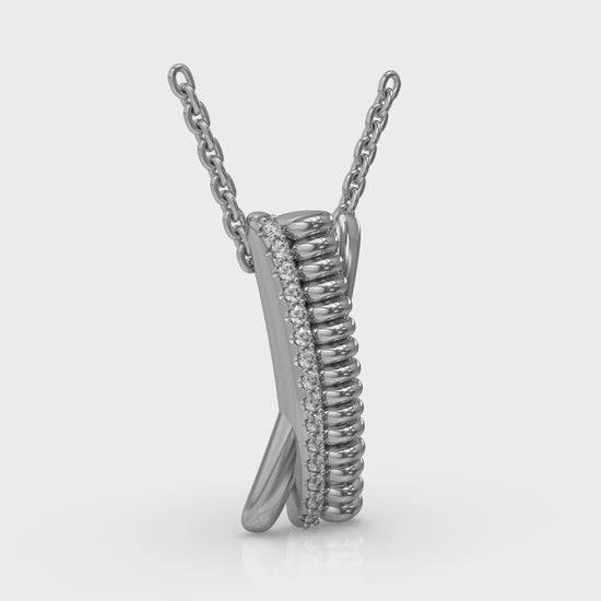 Two bold bands form an intersecting pattern, symbolizing the harmony between power and grace. With every movement, light dances across the surface of this strikingly dimensional diamond pendant, reminding you of your own strength and elegance. Let this versatile necklace be your talisman of courage and inner beauty.