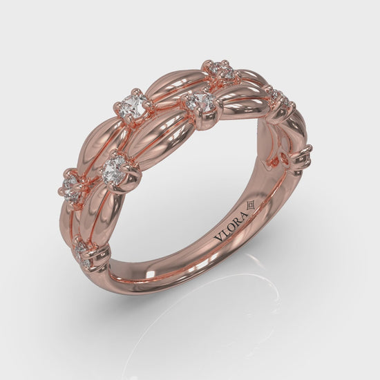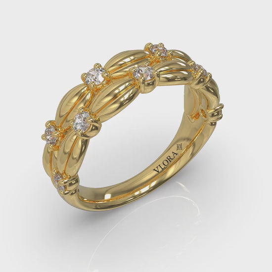 Delicate yet substantial, this elegant ring is adorned with brilliant diamonds showcasing its elegantly scalloped profile. The highly polished dimensional and sculptural shape catches the light from every angle. Timeless yet unique, this beautiful double band is a touch of beautifully crafted luxury that you can wear every day.