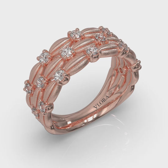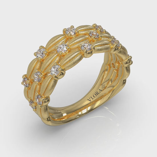 Bold yet beautifully detailed, this sophisticated ring has three rows of sparkling diamonds adorning its elegantly scalloped silhouette. This timeless style has the dimension and intricacy of sculpture. Like a symmetrical stack of rings styled to perfection, the soft satin finish gleams in the light. Wear this lovely band to add luxury to every day.