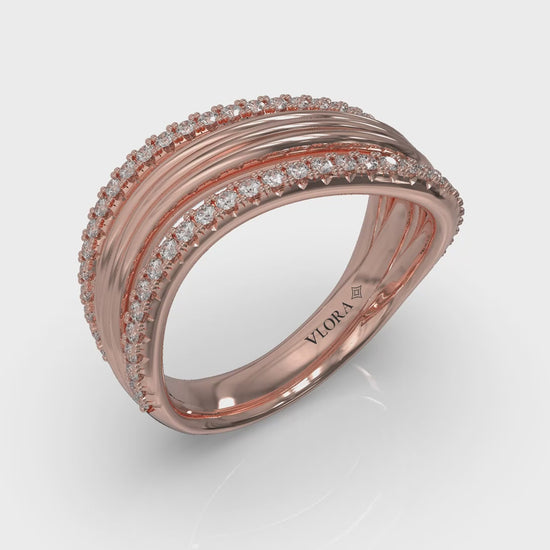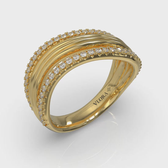 With the harmony of surf breaking rhythmically against the shore, this triple ring has a rippling wave edged with diamonds on both sides. The layered design flows seamlessly around your finger, blending refined curves with a modern edge. A symphony of motion poised in metal and diamond, this fluid ring embodies the relaxed luxury of a day at the shore.