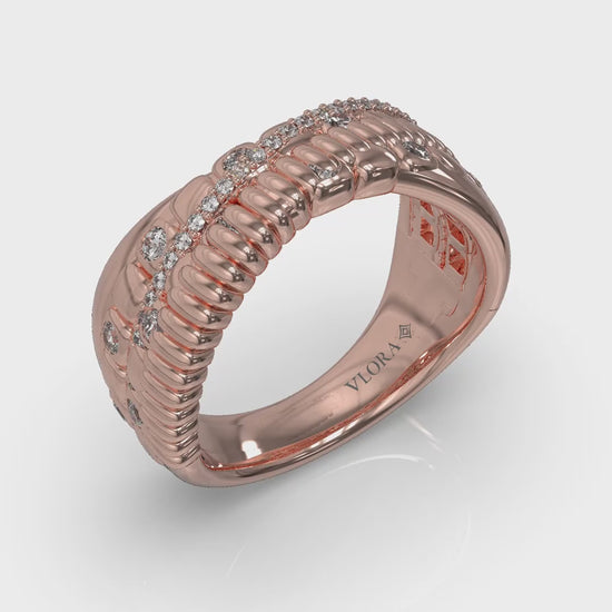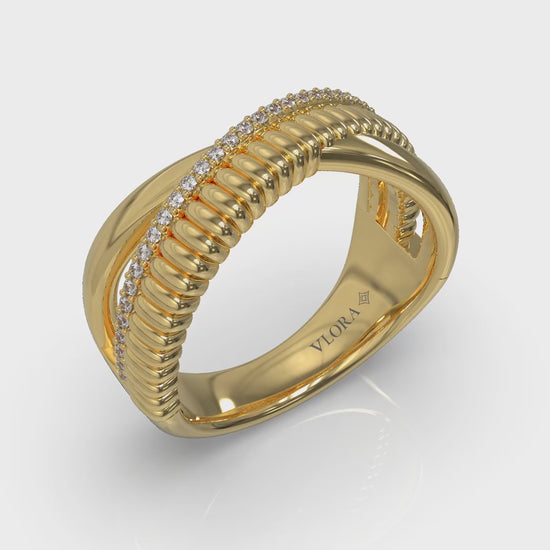 Embrace strength and sophistication with this sculptural crossover ring. Interlaced bands of polished gold and ribbed texture meet a graceful line of pavé diamonds, symbolizing unity, confidence, and timeless elegance.