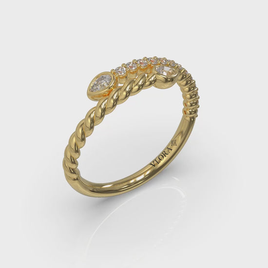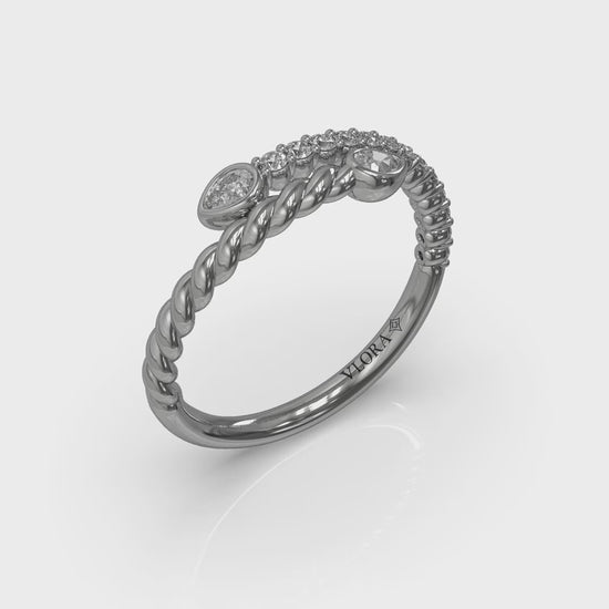 Serpentine coils and modern motion define this stylish bypass design, pavé diamonds glistening and a polished twist shining in the light. Two bezel-set pear shape diamonds add the romantic symbolism of a toi et moi design celebrating you and me forever. It’s a poetic emblem of paths crossing and lives entwining, perfect for stacking or a statement on its own.