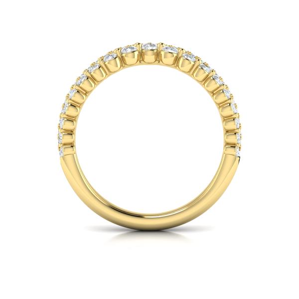 This delicately contoured band features a graceful chevron peak, designed to trace the curve of your engagement ring and highlight your center stone. A sparkling double dose of diamonds shimmers along the contour, bringing a touch of sparkle to your daily love story. Whether worn alone or as a perfect match to your solitaire, this refined design celebrates the beauty of love and harmony forever.