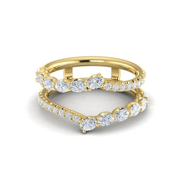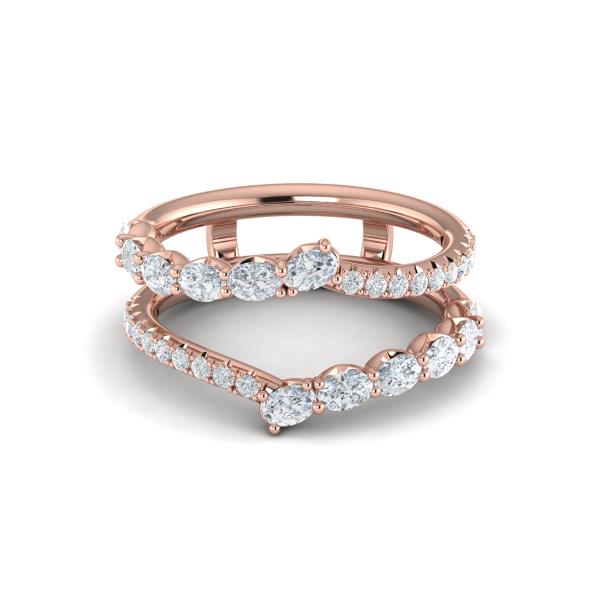 This elegant engagement ring enhancer sparkles with oval and round brilliant diamonds. The chevron silhouette gracefully wraps around your engagement ring like a shimmering embrace. The mirror-image design expresses the way your love is reflected back to you in a radiant dance of partnership. Perfect for those who seek both brilliance and harmony, this enhancer seamlessly complements and accentuates your engagement ring with grace and sophistication.