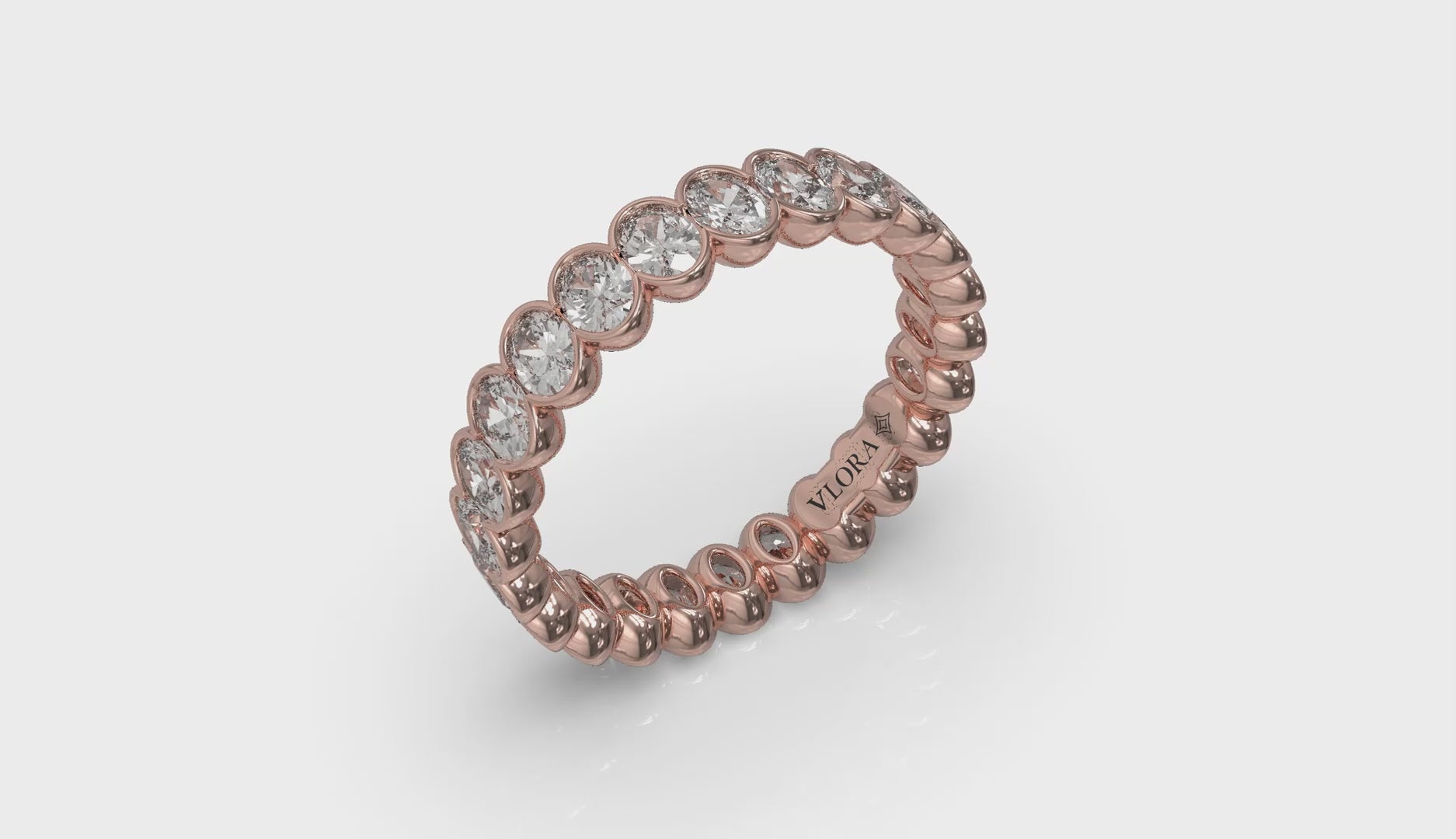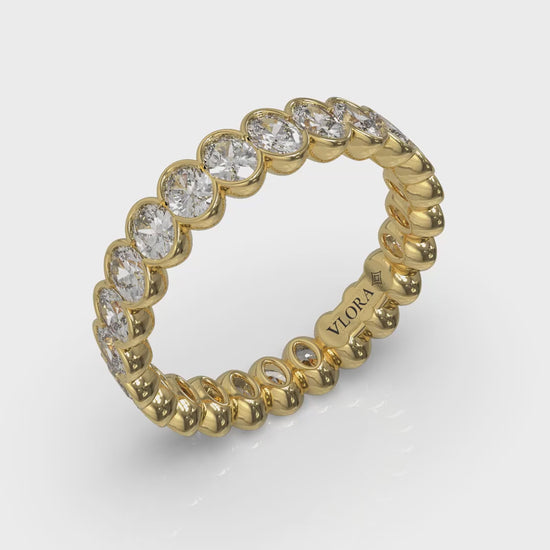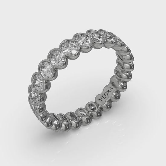 Like an unending circle of infinity symbols, this eternity band features elegant oval shape diamonds set edge-to edge to maximize sparkle. The scalloped edge of the semi-bezel setting both protects and highlights the graceful curves of the diamonds. This finely crafted eternity ring beautifully symbolizes a love that's forever.