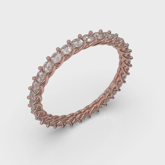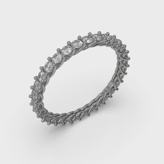 Like two lives woven into one, this delicately crafted eternity band ring has threads that interlock to hold the diamonds. Surrounding your finger in an infinite circle of brilliance, this timeless design symbolizes the network of connections that bring you together. Wear this classic eternity ring to add brilliance to your forever after.