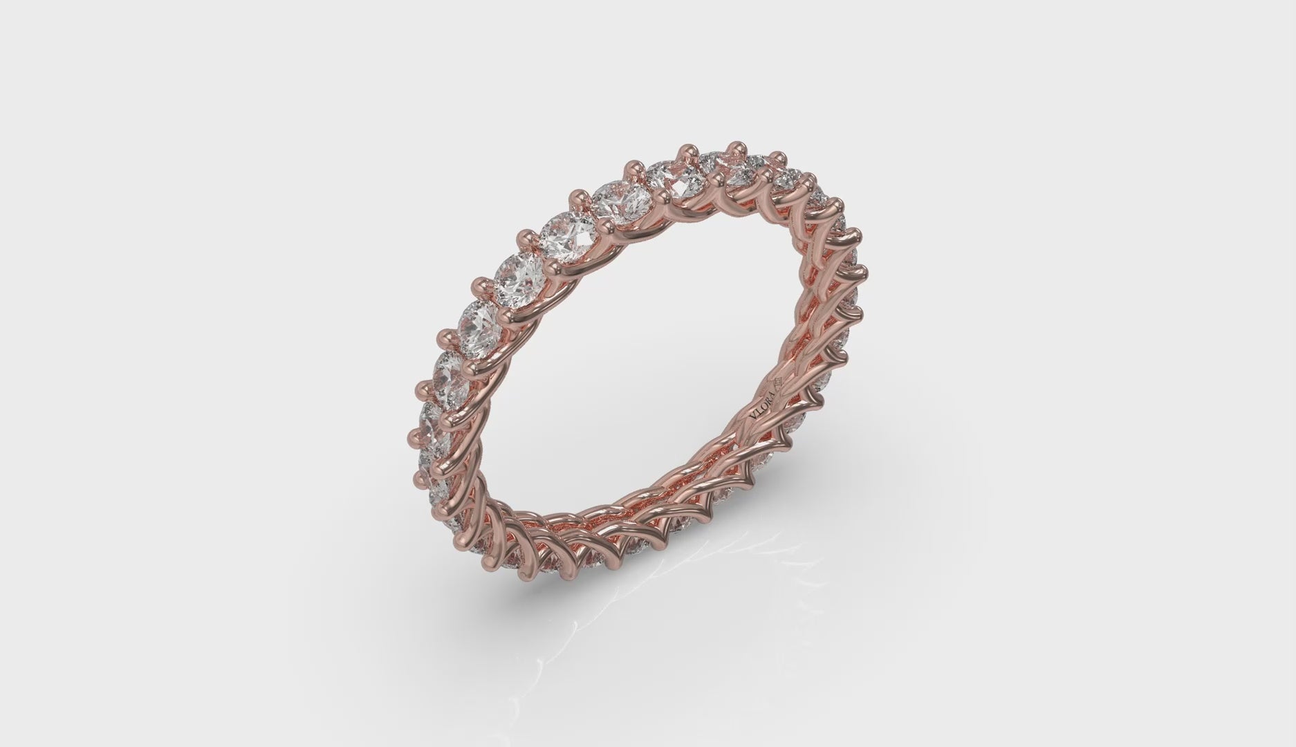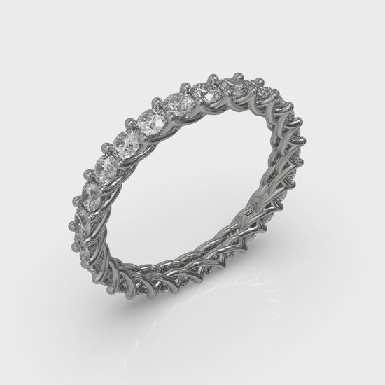 An endless circle of round brilliant diamonds sparkles in a meticulously woven eternity ring that celebrates connection and unity. The artfully entwined setting softly embraces each stone, symbolizing two lives that are beautifully interwoven into one. Perfect for marking milestones of love, this eternity band is a timeless tribute to your everlasting bond.