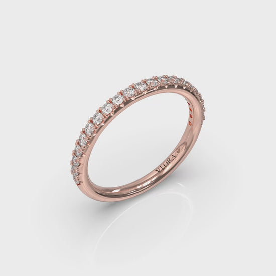 Matching Band for VST20029. A testament to timeless love, this elegant three-stone diamond halo engagement ring pairs vintage charm with modern artistry. A graceful oval diamond takes center stage, flanked by two round diamonds for added brilliance. Halos surround all three diamonds and a diamond band elegantly adorns the finger, a sparkling promise of forever.