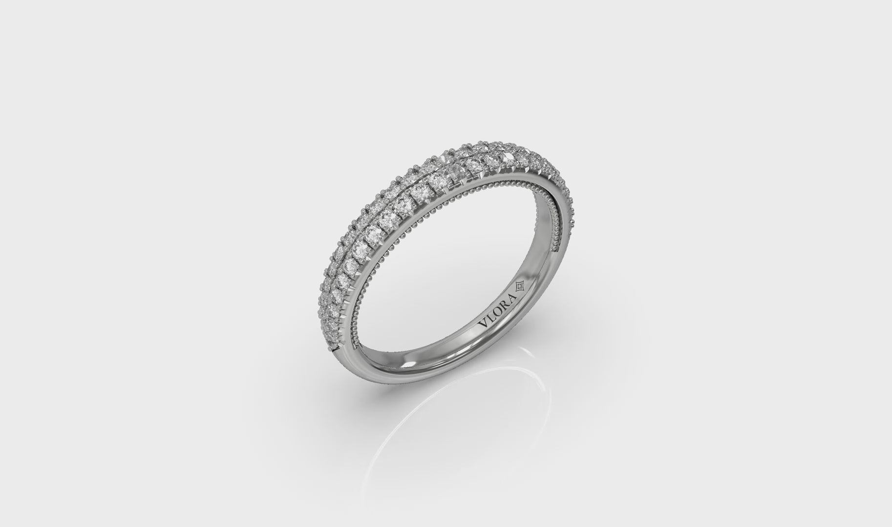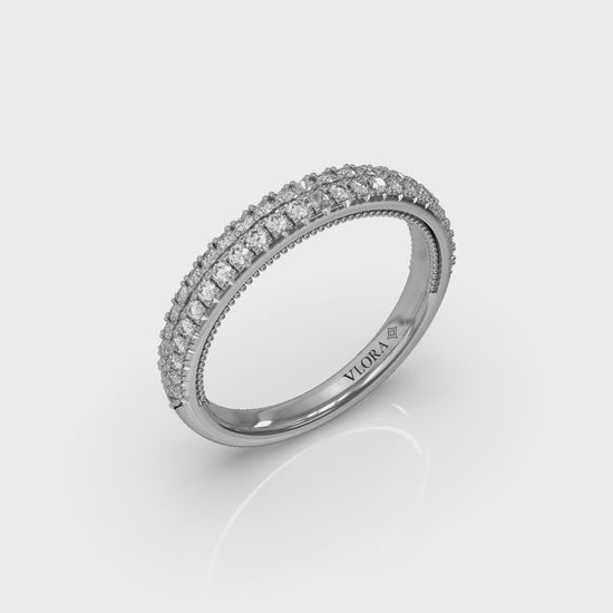 Matching Band for VSH20058. Embrace elegance with this captivating modern vintage engagement ring. The graceful curves of an oval diamond shine within the frame of a bezel, surrounded by a brilliant pave halo that enhances its charm. The double row pavé band shimmers like stardust. Each carefully crafted intricate detail of this oval bezel engagement ring celebrates the timeless power of love.