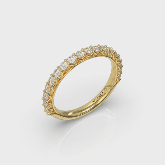 Matching Band for VSC20085. Like two lives becoming one, the settings on this modern vintage engagement ring have woven details like beautiful overlapping threads joining together. The intricately detailed scalloped details and hidden halo underneath the center stone enhance the profile view and also let in lots of light, enhancing the sparkle of the perfectly matched accent diamonds. This beautifully crafted hidden halo round engagement ring is the perfect symbol of your forever love.