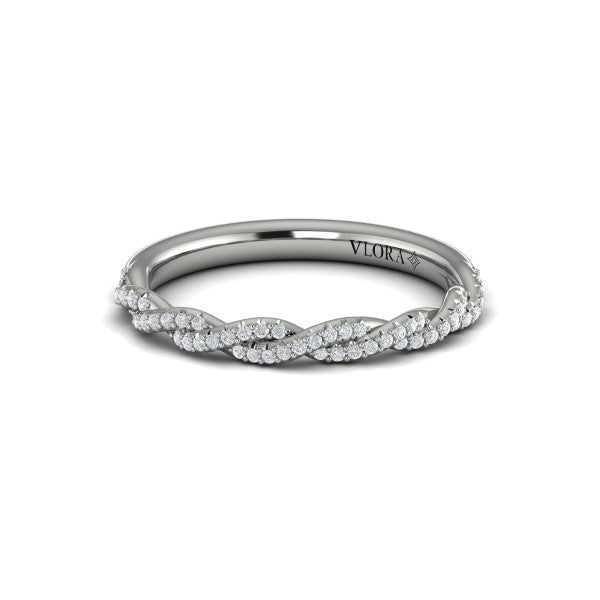 Matching Band for VSC20103. The delicate twisting design of this romantic hidden halo round engagement ring celebrates two lives becoming one. Sparkling pave diamonds symbolize the lasting power of love to make every day more brilliant. The center round brilliant diamond is elevated to gather light in Vlora's signature V-shaped setting. A hidden halo adds extra sparkle to the profile view. There's no better way to celebrate all the ways your lives are now entwined.