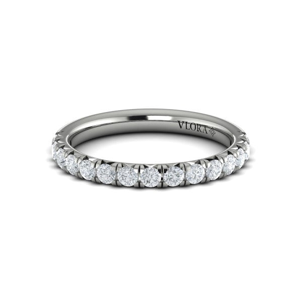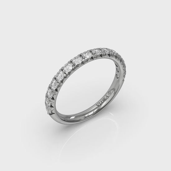 Matching Band for VSC20189. A timeless emblem of love and elegance, this meticulously crafted classic engagement ring has beautiful details that elevate its design. The Vlora signature V-shape setting raises the center round diamond to catch the light and your eyes. French pave diamonds on the cathedral band have extra cut-outs for even more brilliance. Delicate diamond pave detailing on the profile adds sparkle, creating an eternal dance of light.