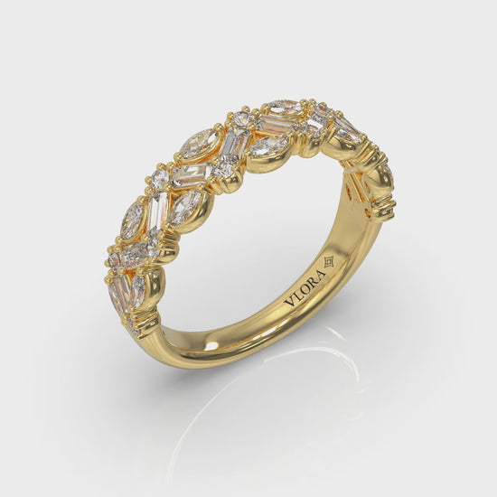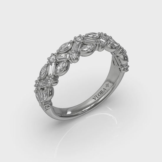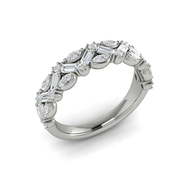 A brilliant pattern of diamonds in different shapes makes an unforgettable statement in this unique stackable band. A striking combination of baguette, marquise and round diamonds gives this stackable band a captivating chevron pattern that catches the light from every angle. Intricately detailed and meticulously crafted, this elegant diamond band is designed to be worn alone, stacked with your engagement ring, or layered with other bands for a modern, personalized look that celebrates your one-of-a-kind style.
