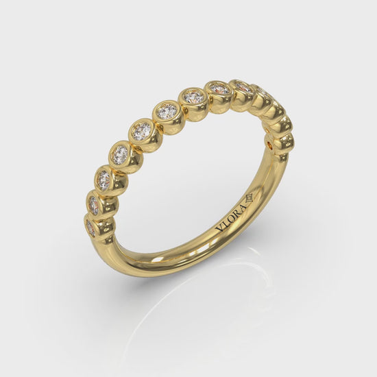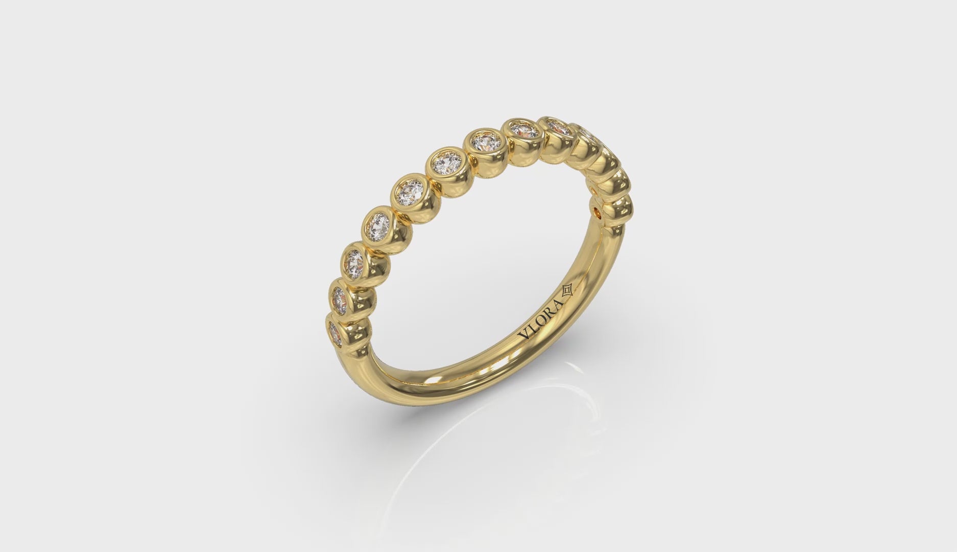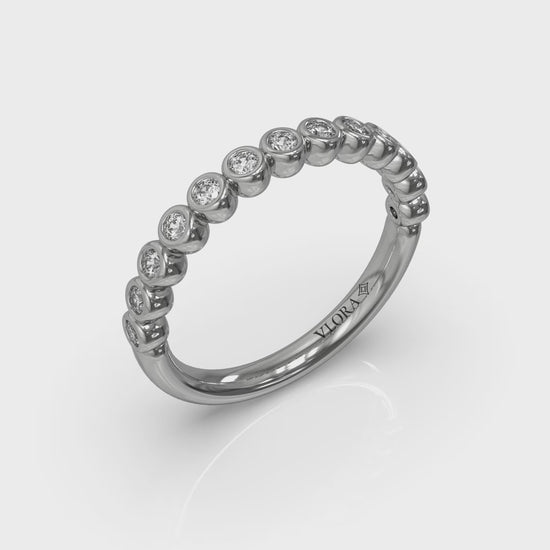 A sparkling line of bezel-set round brilliant diamonds creates a modern twist on timeless elegance. Designed to pair perfectly with an engagement ring or layer with other bands in your own curated mix, this streamlined and effortless diamond band ring is the epitome of quiet luxury. This versatile band is perfect for stacking and layering your love stories, every day and forever.