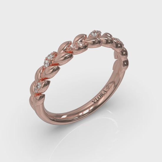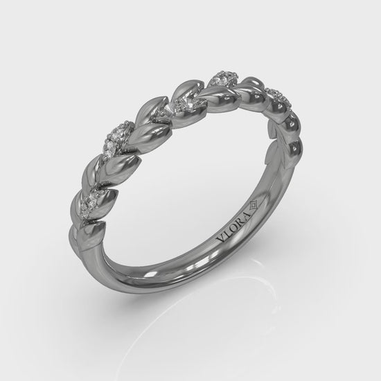 Love and abundance shine in this classic stackable band with an elegant wheat pattern that symbolizes a bright and prosperous future together. Sparkling diamonds illuminate the beautifully crafted details. Perfect for wearing alone or with your engagement ring, this meaningful ring is as timeless as it is romantic, honoring life’s milestones with understated elegance. Designed to be layered or worn solo, it’s an enduring tribute to love’s resilience and prosperity, reflecting the promise of a future beautifully intertwined.
