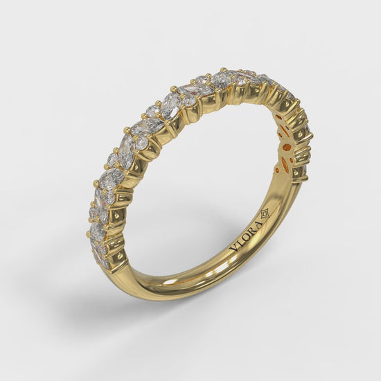 Give a romantic bouquet that never fades. Graceful marquise shape diamonds surround round diamond accents like sparkling leaves embracing brilliant flower buds. The delicate pattern of facets dances with light when you move your hands. Wear this finely crafted ring alone or layered with your engagement ring as a wedding band or anniversary band. Either way, it's a meaningful tribute to love in full bloom.