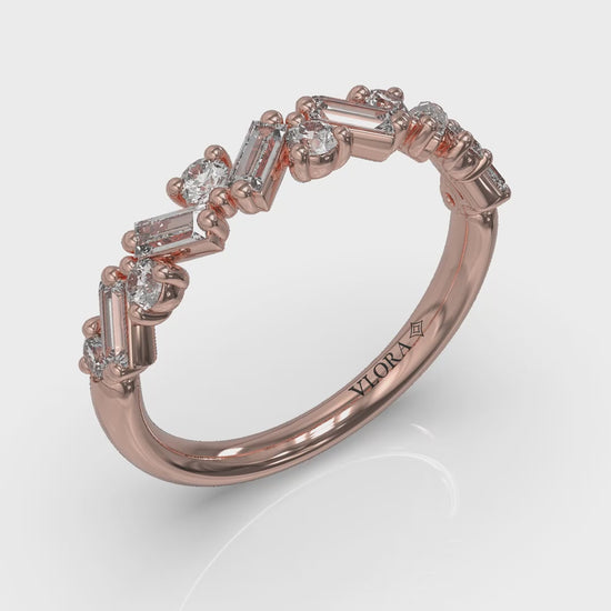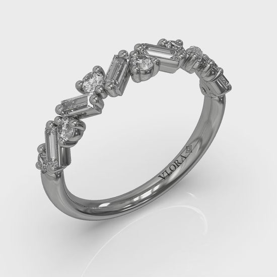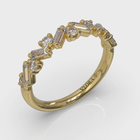 Like a festival of sparkle, the gems in this gorgeous stackable diamond band radiate positive energy. Baguette and round cut diamonds cascade across the finger symbolizing a lifetime of happiness to come. Wear this band solo or stacked with an engagement ring as a diamond wedding band or diamond anniversary ring. It's a beautiful tribute to the one who fills your life with joy.