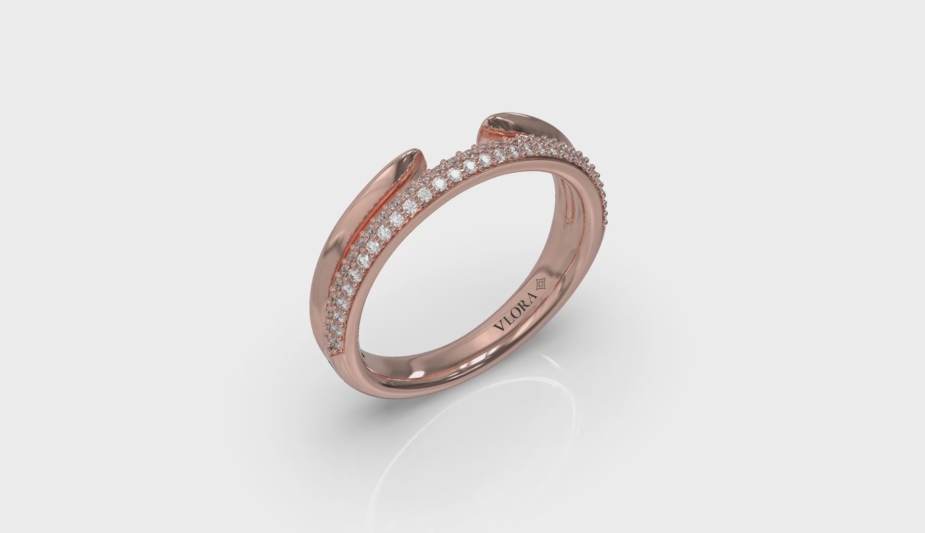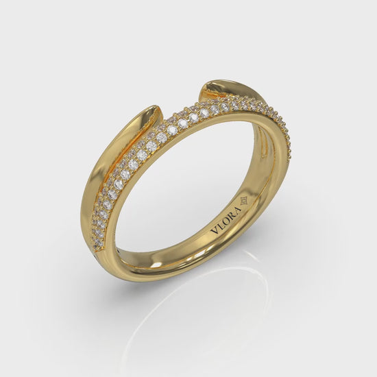 This striking open silhouette diamond wedding band features double layers adorned with shimmering pavé diamonds, offering the perfect embrace for your engagement ring. This innovative stackable wedding ring design makes a seamless modern statement, the perfect expression of the way your love brings you together. Designed for effortless stacking, it’s a brilliant way to say that you are meant for each other.