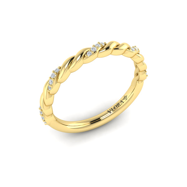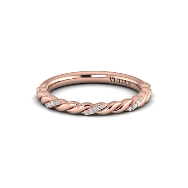 Interlacing strands of polished gold and pavé-set diamonds create a luminous braid that symbolizes connection and strength. Each curve is artfully crafted to capture light from every angle, giving the design a graceful movement and radiant depth. Timeless yet modern, the braided pavé band beautifully represents the intertwining of two lives — elegant on its own or as part of a cherished bridal set.