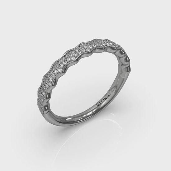 This elegantly fluted stackable band features a rhythmic wave of pavé diamonds, gracefully reflecting light with every movement. Designed for effortless stacking, it adds a touch of vintage-inspired charm and sparkling sophistication to your look—individually or in a curated stack.